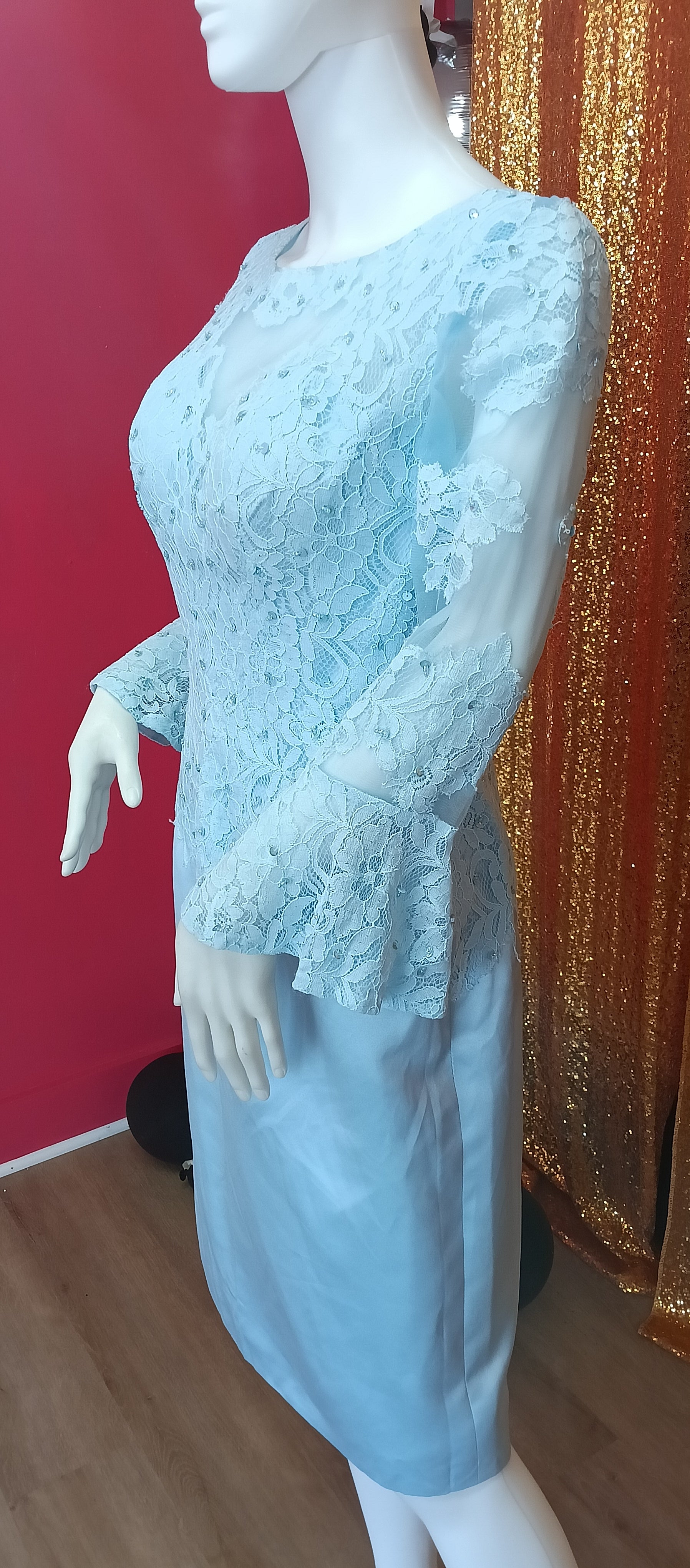 Baby blue long sleeve lace formal dress